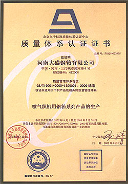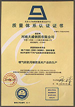 本公司質(zhì)量管理體系符合GB/T9001-2000-ISO9001:2000標準,于2002年8月獲得北京九千標準質(zhì)量體系認證中心頒發(fā)的質(zhì)量體系認證書。